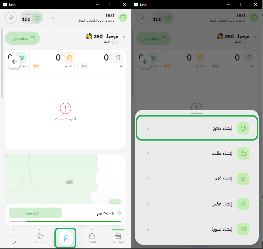 من لوحة التحكم الرئيسية (نظرة عامة)، اضغط على الزر المركزي "F" الموجود في منتصف شريط التنقل السفلي. هذا الزر هو بوابتك السريعة لإضافة عناصر جديدة لمتجرك.