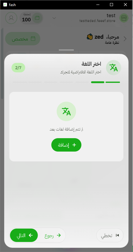 اختر اللغة التي سيظهر بها متجرك للعملاء — هذه هي الخطوة الثانية من إعداد متجرك (2/7).