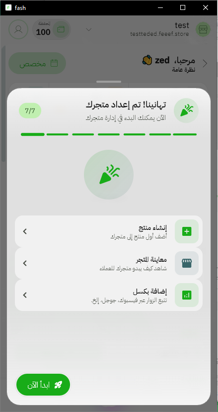 عندما تكون مستعداً للانطلاق، اضغط على زر ابدأ الآن الموجود أسفل الشاشة للتوجه إلى لوحة التحكم الرئيسية الخاصة بمتجرك، حيث يمكنك التحكم في كل شيء وبدء رحلتك في التجارة الإلكترونية مع فيف!